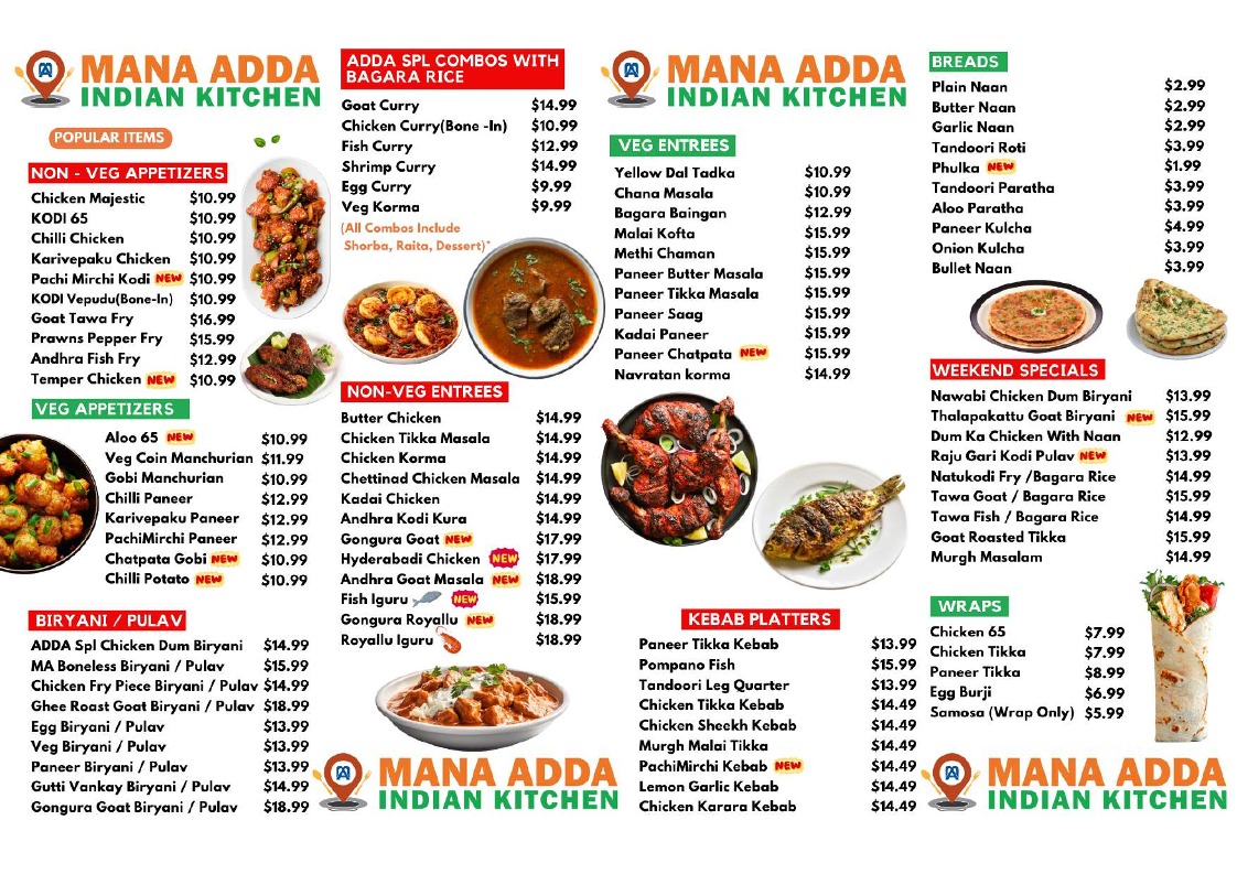 Introducing the menu at Mana Adda Indian Kitchen, located in Prosper, Texas, is a culinary journey through authentic Indian flavors. Their offerings are diverse, with a special focus on exquisite biryanis, including Veg, Chicken, Goat, and Paneer Biryani options, served in generous buckets perfect for sharing. The breakfast selection is equally enticing, featuring classics like Pongal and Idli. For those craving a comforting Pulav, choices range from Paneer to Shrimp Pulav, each prepared with traditional spices that evoke the essence of home-cooked meals.